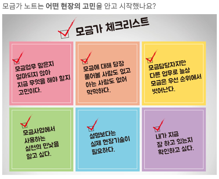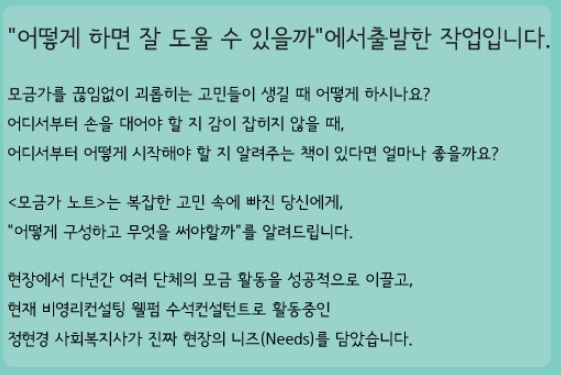 모금가 노트의 시작 “어떻게 하면 잘 도울 수 있을까”에서 출발한 작업입니다. 비영리단체들의 척박한 환경과 변하지 않은 구조. 그러나 자원개발(모금)의 성과들은 지속적으로 성장하고 있��